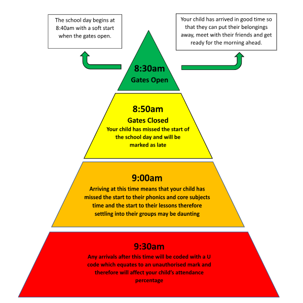 Drop off: The school gates open at 8.30am. Your child should be in school by 8:40am for the start of the school day. The school gates will close at 8:50am and if you arrive after that, you must enter the school via the school office where this will be recorded as a late mark.