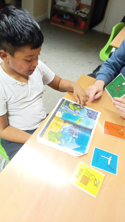 In the intervention groups, our theme has been under the sea, and we've been reading Shark's Big Surprise. In IG3 and IG2, they've been using colourful semantics to identify who, what, where, and what they are doing – and starting to create sentences using these answers. In IG1, they've been expanding their vocabulary – whether upscaling their language during interventions such as box clever, or identifying colours, pictorial representations of objects. And lots of children have been making huge progress reading through the RWI phonics books, and are now writing words from the book from memory.