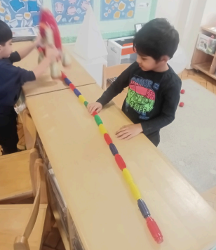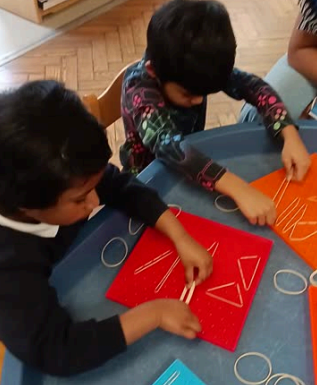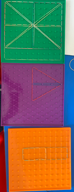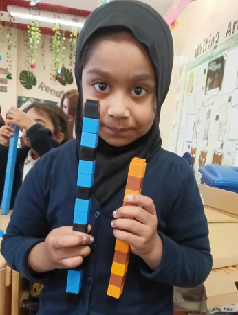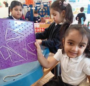 Using objects to support learning is key, and all year groups do it and here are just a few examples. In Nursery, children have been exploring how to make a rocket using different objects and shapes. They also used bricks to create different patterns.